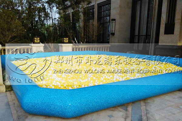 在原来的移动水上乐园设备,把水池内的水换成很多个白蓝相间的海洋球。孩子们从滑梯上滑落到厚厚的海洋球内,欢声笑语依旧不断。还可以摆放上一些夏季的水上浮具: 香蕉船、水狗、冰山、小蹦床、滚筒等等,既增加了海洋球的玩法,也让这些水上浮具有了用武之地,一举两得。这种新奇的搭配方式,让你的移动水上乐园一年四季都可以玩。