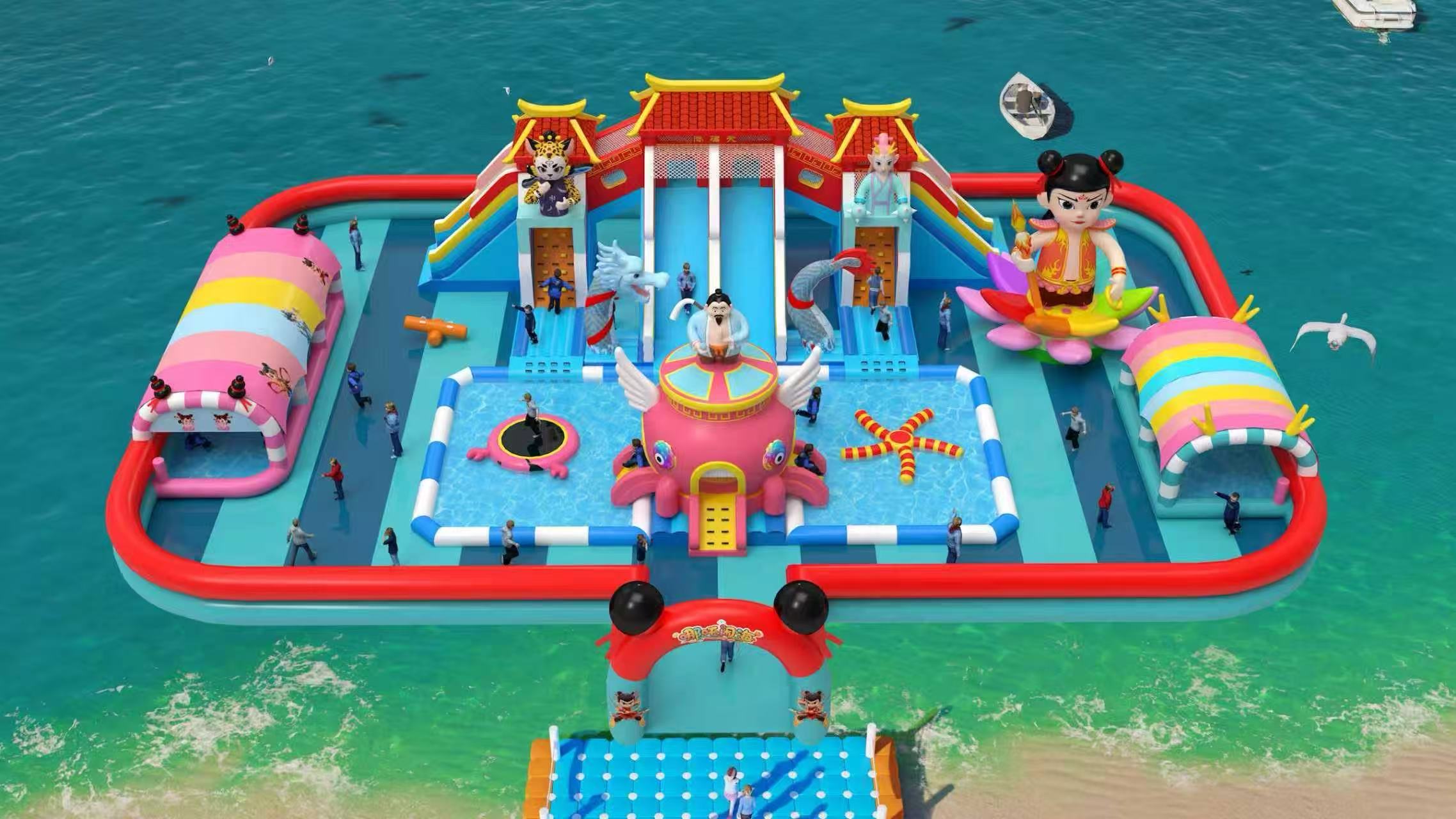 哪吒闹海内部可以根据客户的需求灵活调整布局,像是滑梯、秋千、海洋球、人物造型等等,都可以进行私人定制,打造专属于你的水上漂浮乐园。
